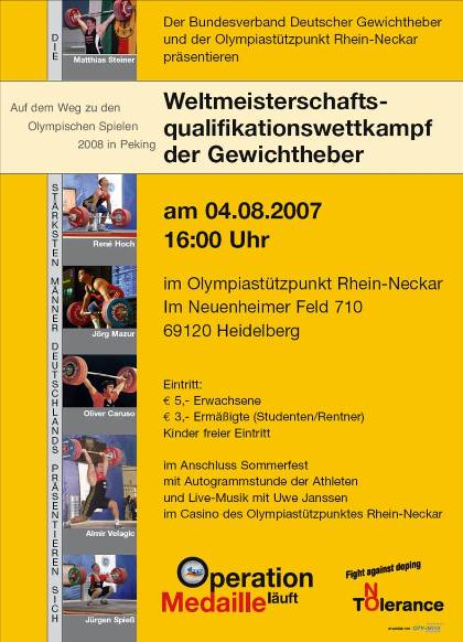 Die Olympiakandidaten des Team Peking 2008 haben bei den 95. deutschen Meisterschaften der Gewichtheber in Obrigheim ihre Titel aus dem Vorjahr verteidigt. Vor rund 1.000 Zuschauern wurde Jürgen Spieß erst als "Gewichtheber des Jahres 2007" geehrt, dann gewann der Forster mit der besten Leistung dieser Titelkämpfe von 265kg (Reißen 165 + Stoßen 200) den Titel in der Klasse bis 94kg. In der Klasse bis 105kg überzeugte der Leimener Jörg Mazur (SV Germania Obrigheim) mit 362kg (172+190).
