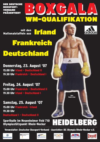 Gottlieb Weiss fährt zur WMBoxen vom Feinsten wurde drei Tage lang bei der zweiten Adidas Boxgala in Heidelberg von Donnerstag bis Samstag geboten, zudem war dieses besonders sportliche Ereignis vom Gastgeber, dem BC Olympia und den Mitarbeitern des Olympiastützpunktes bestens organisiert. Dem Sportdirektor des DBV, Helmut Ranze, ist es dabei gelungen, mit den Mannschaften aus Frankreich, Irland und zwei deutschen Vertretungen ein Programm zu bieten, das auch bei den zahlreich erschienenen Boxanhängern großen Anklang fand. Dort trafen vier Mannschaften nach dem berühmten „Round Robin-System“ aufeinander, ermittelten in sechs Veranstaltungen die beste Mannschaft und die deutschen Athleten für die im Oktober in Chicago stattfindenden Weltmeisterschaften. Frankreich präsentierte sich besonders stark und gewann auch den Mannschaftspokal dieser Adidas Boxgala 2007 mit 5.1 Punkten vor Deutschland I 3:3, Deutschland II 2:4 und Irland ebenfalls 2:4. Als bester Boxer des Turniers wurde der Ire Darren Sutherland auserkoren, der auch die stabilste Leistung vollbrachte.Mit dem Adidas Gürtel wurden die erfolgreichsten Boxer in den einzelnen Gewichtsklassen ausgezeichnet:51 Kg: Ronny Beblik (GER I), 54 Kg: Ali Halab (FRA), 57 Kg: Khedafi Djelkhir (FRA), 60 Kg: Daouda Sow (FRA), 64 Kg: Alexis Vastine (FRA), 69 Kg: Jack Culcay-Keth (GER II), 75 Kg: Darren Sutherland (IRL), 81 Kg: Kenneth Egan (IRL), Rene Krause (GER II) Gottlieb Weiss (GER I) je zwei Siege, 91 Kg: Alexander Povernov (GER I) +91 Kg: Stefan Köber (GER I). Tribut zollen mussten schon vor dem Turnier und während der Gala einige Athleten des DBV, so konnten Rustam Rahimov und Harun Sipoahi wegen Verletzungen nicht antreten, auch durften Andreas Propp, Marcel Herfurth, Artur Schmidt, Alexander Miller wegen teilweise leichteren Blessuren nicht mehr in den Ring klettern. Überzeugende deutsche Boxer waren Ronny Beblik, Jack Culcay-Keth, Gottlieb Weiss, trotz einer Niederlage, Alexander Povernov und Stefan Köber. Während der Pressekonferenz nach der letzten Veranstaltung wurde das Team von Deutschland für die WM in Chicago vom Sportdirektor Helmut Ranze nominiert: 51 Kg: Ronny Beblik (BC Chemnitz) 54 Kg: Rustam Rahimov (Velberter BC) 57 Kg: Marcel Herfurth (SV Halle) 60 Kg. Artur Schmidt (VfB Marl-Hüls) 64 Kg: Martin Dressen (BSC Schwerin) 69 Kg: Jack Culcay-Keth (TG Darmstadt) 75 Kg: Konstantin Buga (NSF Berlin-Neukölln) 81 Kg: Gottlieb Weiss (BAC Hockenheim) 91 Kg: Alexander Povernov (BC Gifhorn) ü91Kg: Stefan Köber (BC Frankfurt/O)