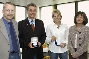 | Dr. Michael Sauer, Weltmeister im Handicap-Vierer und seit wenigen Wochen Mitglied im Team Peking 2008 der Metropolregion Rhein-Neckar, erhielt gestern den Silbernen Löwen der Stadt Ludwigshafen. Der Preis wurde überreicht von Oberbürgermeisterin Eva Lohse und ist der höchste Sportpreis, den die Stadt vergibt. Zusammen mit Michael Sauer wurde Fußball-Weltmeisterin Silke Rottenberg geehrt. |  |