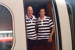 | Heute um 15.35 Uhr starteten Hockey-Bundestrainer Markus Weise und Mittelfeldspieler Niklas Meinert auf dem Mannheimer Hauptbahnhof ihre Mission Olympia. Über Frankfurt ging es nach München und von dort in die chinesische Hauptstadt. Derweil sind die Hockeyfrauen schon in Peking angekommen und berichten, dass alles sehr angenehm sei, sogar die Sonne wäre zu sehen gewesen. Die Temperaturen sind angenehm warm, aber nicht schwül. Für Fanny Rinne und Mandy Haase beginnt das Turnier am kommenden Sonntag Abend, die Herren sind einen Tag später dran. |  |